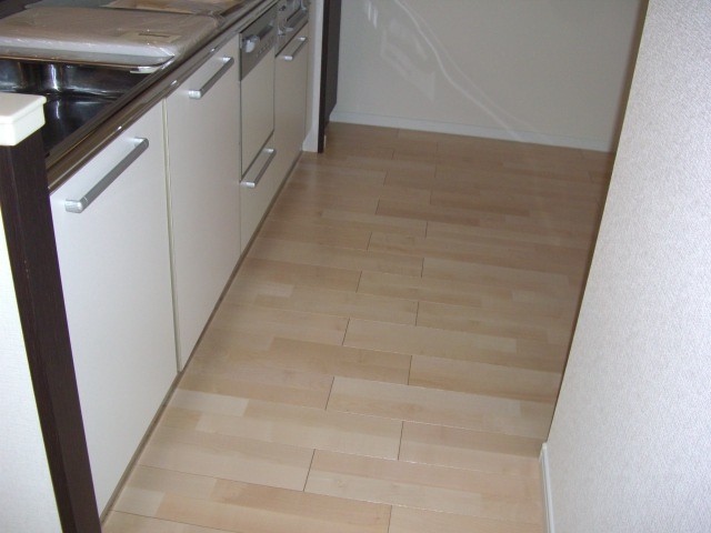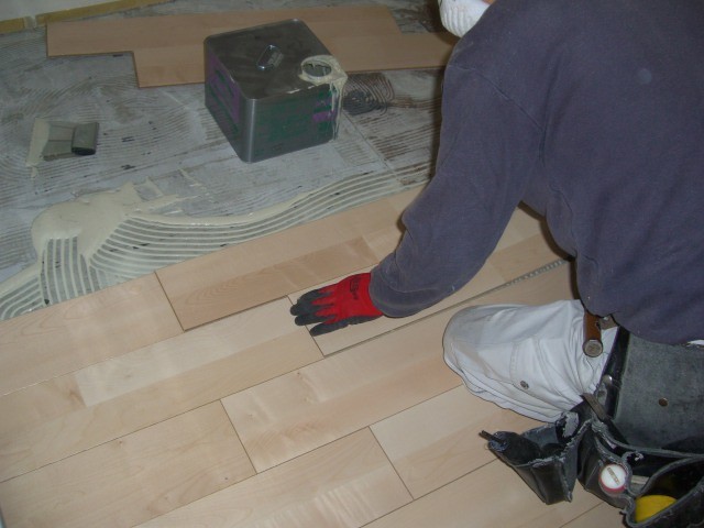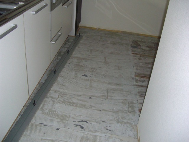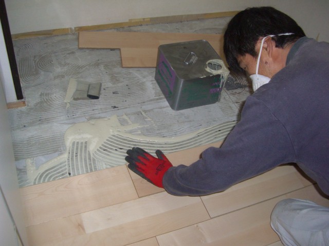 キッチン前の施工風景です。パズルのようにはめ込みボンドで接着します。