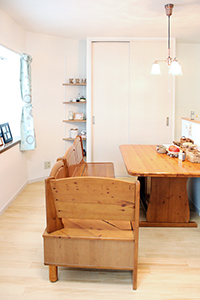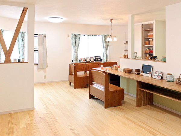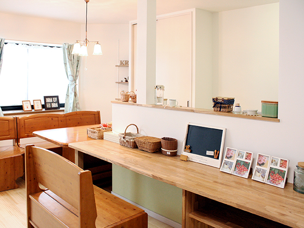 ご友人をたくさん呼べるようにと、キッチン前にカウンター収納を設けました。お手持ちのダイニングテーブルと合わせて一体的に使用できる、ゆったりとしたダイニングスペースです。カウンター内部のアクセントクロスでおしゃれ度もアップ!