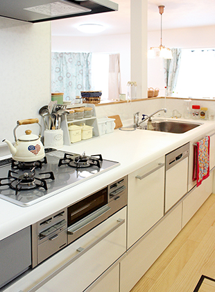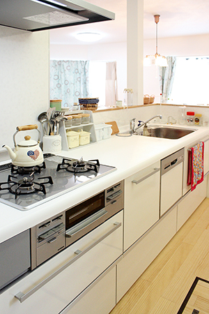 吊戸棚を設けず、明るく開放的なキッチンスペースに。