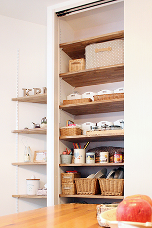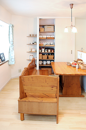 壁面には収納、三角のスペースにも棚を造作し、奥様ご趣味の小物が映える「見せる収納」に。