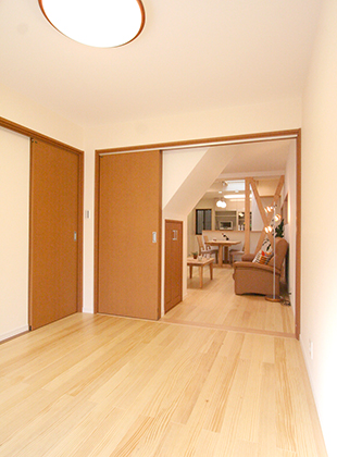 動線を短くすることと、南側からの光を取り入れる為に、LDK空間と繋げた寝室。