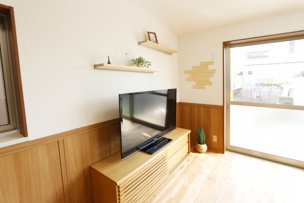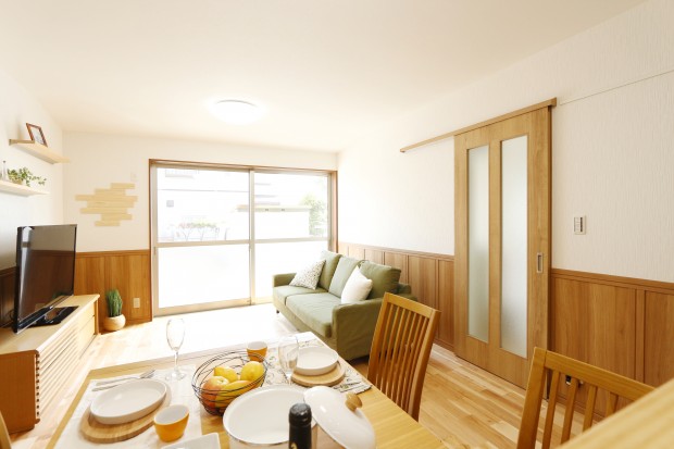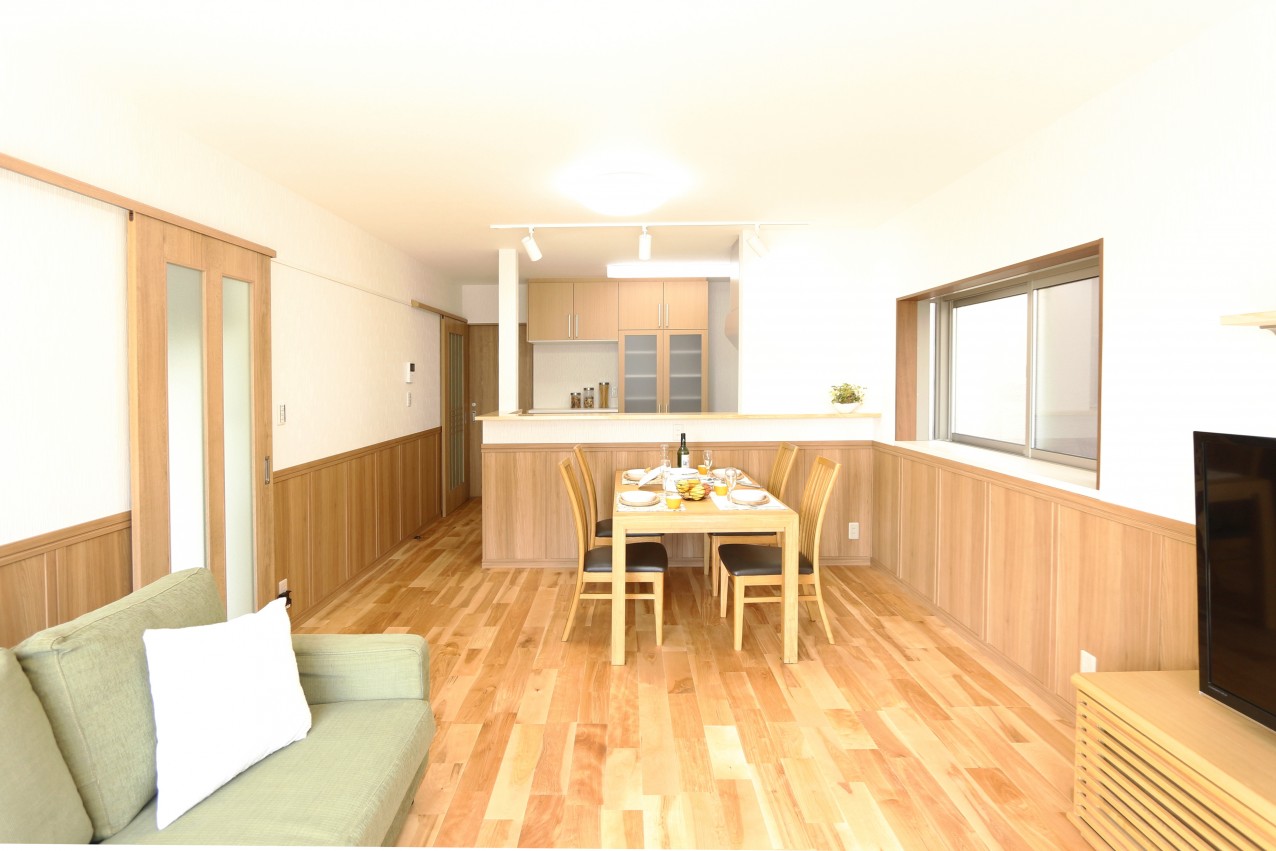 LDKは、無垢材を張り、ナチュラルに仕上がっています。 壁には、お孫様が触っても壁が汚れないよう羽目板を張っています。 2世帯でリフォームしたことにより、お孫様と過ごせるLDKとなりました♪