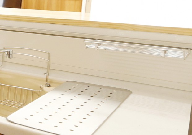 お掃除がしやすいように、レンジフードとIHコンロのハイバックカウンターにレールを取り付けました。