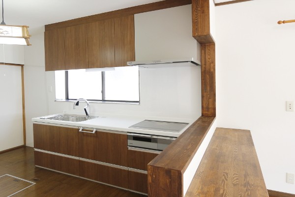 キッチン:パナソニック リビングステーション Vスタイル I型 W2400 (IHコンロ)、天井:クロス貼り替え