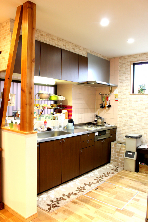 「キッチンに立っていると横の壁がなくなっただけでダイニングとの繋がりがとても感じられます。ちょっとしたことで全然ちがいますね」と奥様にもご好評です。奥様が気に入られたキッチン廻りのレンガ調のアクセントクロスが際立っています