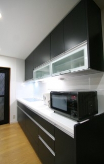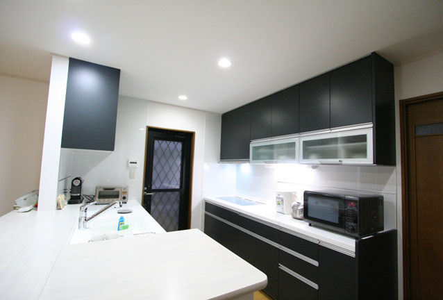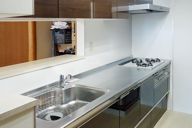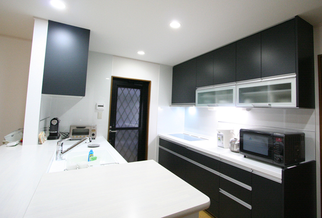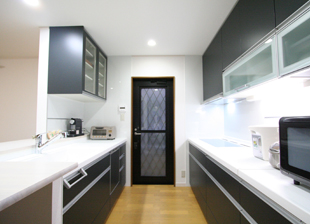 白とこげ茶を基調にした、シックな印象のキッチンに。