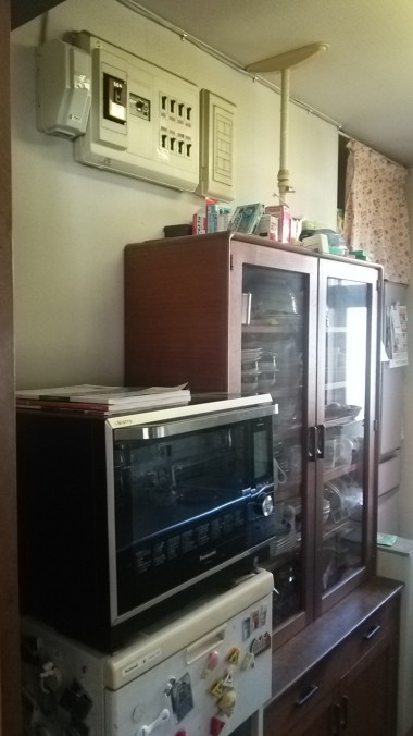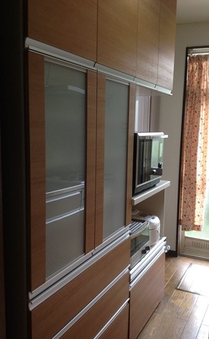 キッチンと同じ柄のキャビネット、分電盤を移設し壁一面の収納にすることでとても収納量が増えました。