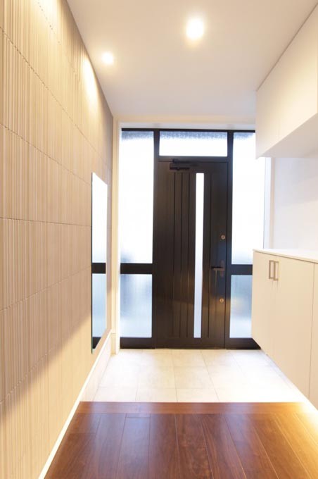 壁にエコカラットを使用しました。靴箱収納下部に間接照明、天井にはダウンライト3つ設置し、計4つが人感センサーで反応するようにしました。