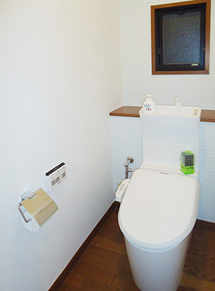 【2Fトイレ】奥の壁はブルーのアクセントクロスで、清潔感のある空間に。