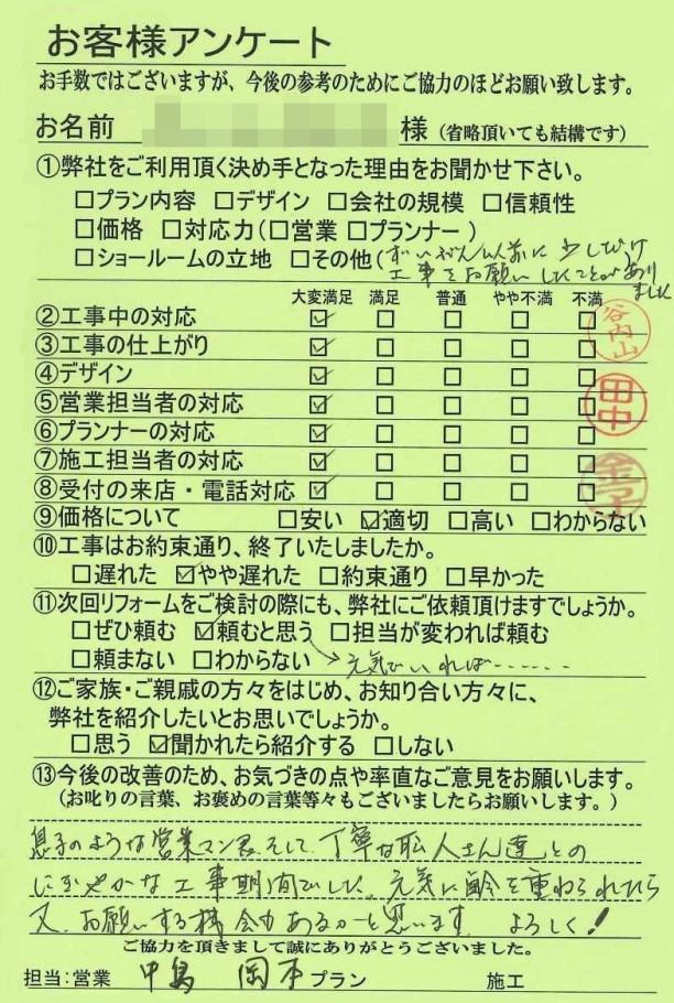この度は工事をお任せ頂き、また工事中にはご配慮いただきまして、誠にありがとうございました。このようなお言葉を頂戴し、とても光栄でございます。何かございましたら、いつでもご連絡くださいませ。今後ともよろしくお願いいたします。