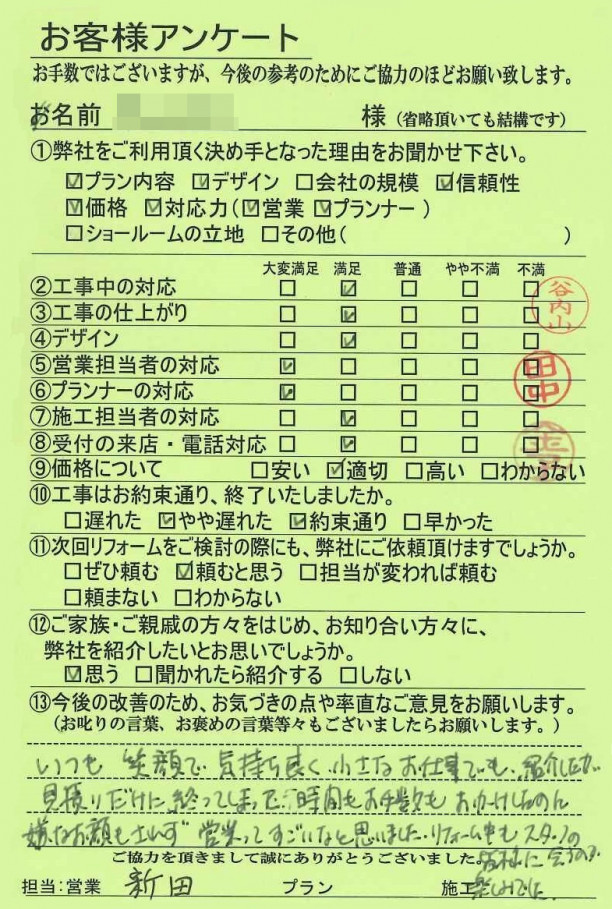 いつも笑顔で気持ち良く、小さなお仕事でも紹介したが、見積だけで終わってしまって、時間もお手数もおかけしたのに嫌な顔もされず、営業ってすごいなと思いました。リフォーム中もスタッフの皆様に会うのが楽しみでした。