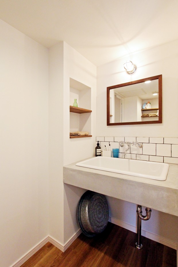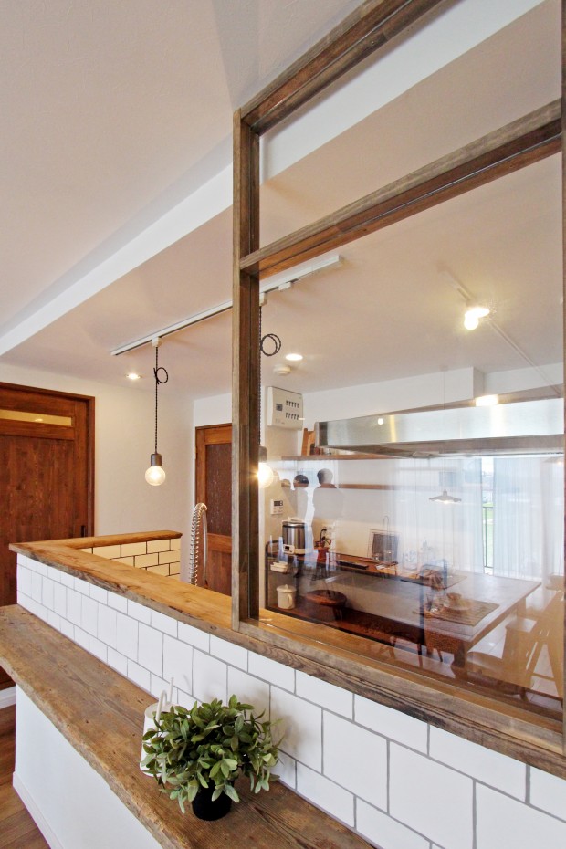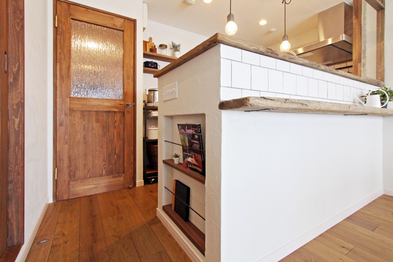 LDKのポイントとなっているカウンターの古材は、実際に古材のショールームまで一緒に探しに行ったりと、W様の想いが形になり私達も大変嬉しく思っています。