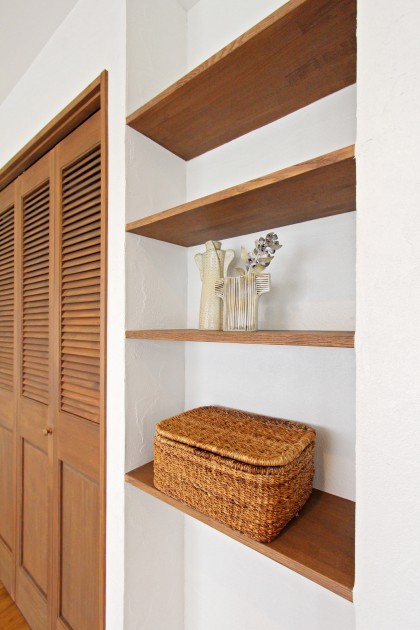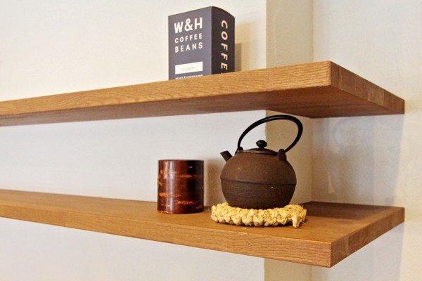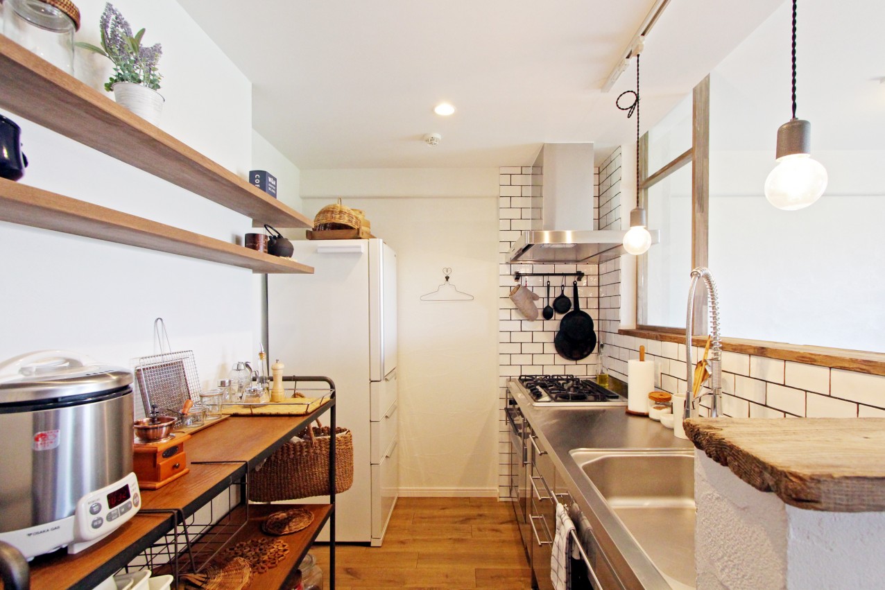 【棚】キッチン後ろの棚は、お手持ちのラックの高さも考慮して造作しました。冷蔵庫横の空間もムダにならないよう、棚をL字にしています!