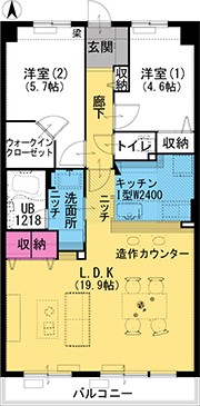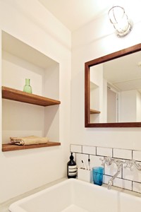 ■施工内容 /キッチン:EIDAI ゲートスタイルⅠ型W2400/洗面台:造作/洗面ボウル:TOTO 医療用シンク/UB・トイレ:既存/床:遮音フローリング(LDK・廊下)、クッションフロア(洗面所)、玄関既存/壁:珪藻土(LDK)、クロス/天井:クロス/キッチンカウンター、収納、ニッチ、棚造作/建具新調/