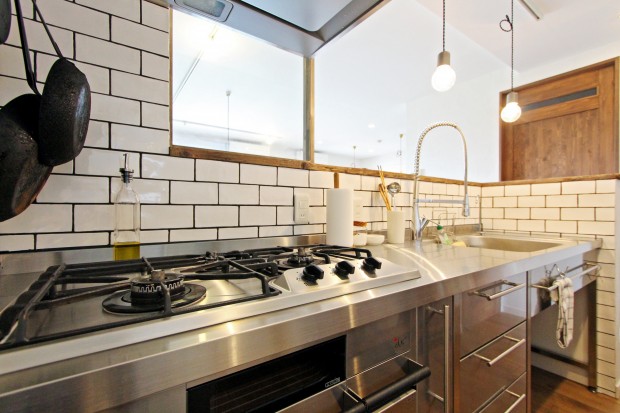 コンロ前にはガラスパネルを取付け、油はねや煙も気になりません!空間の雰囲気を損なわないよう木製のガラスパネルを使用。コンロからの距離は防火面を考慮しています!