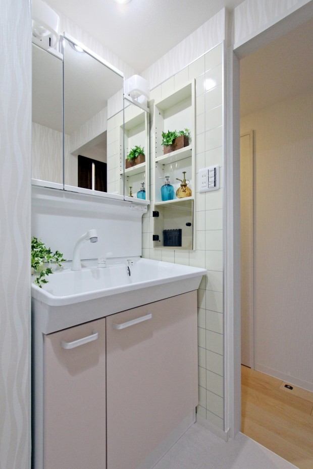 【洗面所】既存のタイルやニッチを残しつつ、新しく生まれ変わりました。洗面化粧台は3面鏡を選び、小物をすっきりと収納できます。