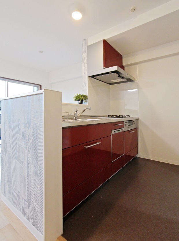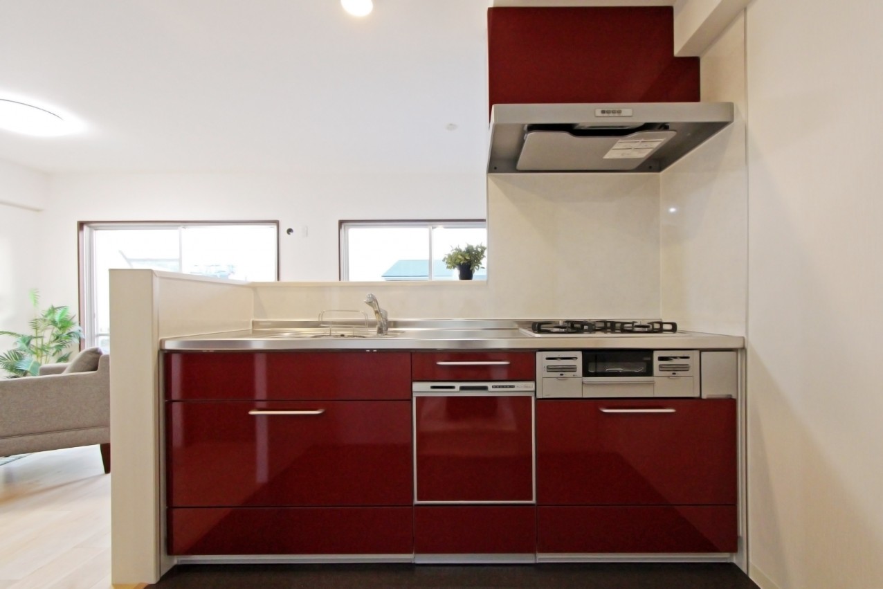 【キッチン】キッチンのサイズはそのまま、周りの袖壁や垂れ壁を無くしたことで、リビングが見渡せる開放感のある空間に。赤色のキッチンがシンプルなお部屋のアクセントに。