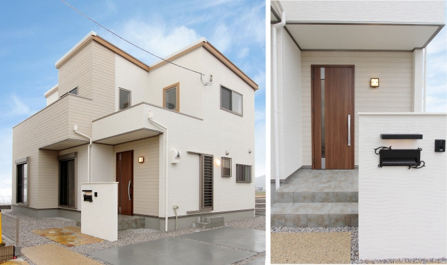 【外観】優しくナチュラルな木目と白壁が美しい上品な外観。人感センサーの玄関ポーチライトとポストデザインがお家全体のイメージとマッチしています。ゆったり駐車スペースで車庫入れもスムーズに。