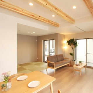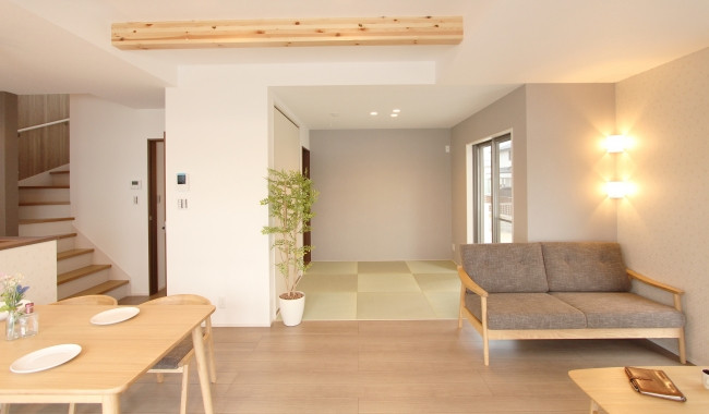 【和室】LDKに接した風通しのよい和室は、お子様のお昼寝やお遊びのスペースとして、また洗濯物の仮置き場としても大活躍!リビングダイニングのアクセント照明も異国情緒あふれるリゾート空間にさせてくれます。