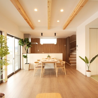 【ダイニング】心地よい風と光が舞い込む大きな開口部に、見せ梁の素敵なアクセントでご家族の笑顔も輝く素敵なお住まいに。