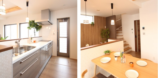 【キッチン】お料理をしながら家族との会話を楽しめる対面キッチン。上品な色合いでまとめられた広々作業スペースでのお料理は、お洒落な盛り付けも増えるはず♪さっと洗える幅広のシャワータイプ水栓、お手入れのしやすいキッチンパネルに、後片付けも楽々な食洗器付きで、毎日せわしい子育て家族にもぴったりです。