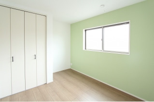 【洋室①】グリーンのアクセント色は、安心感を与え、心身のバランスを整える効果があります。