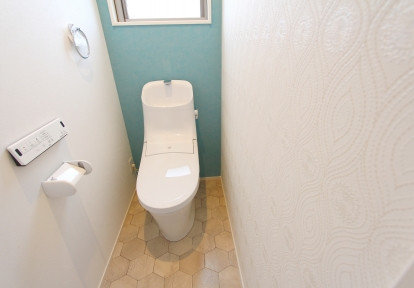 【トイレ】ブルーの塗壁風クロスと上品な柄のクロスが清潔感のありるトイレスペース。