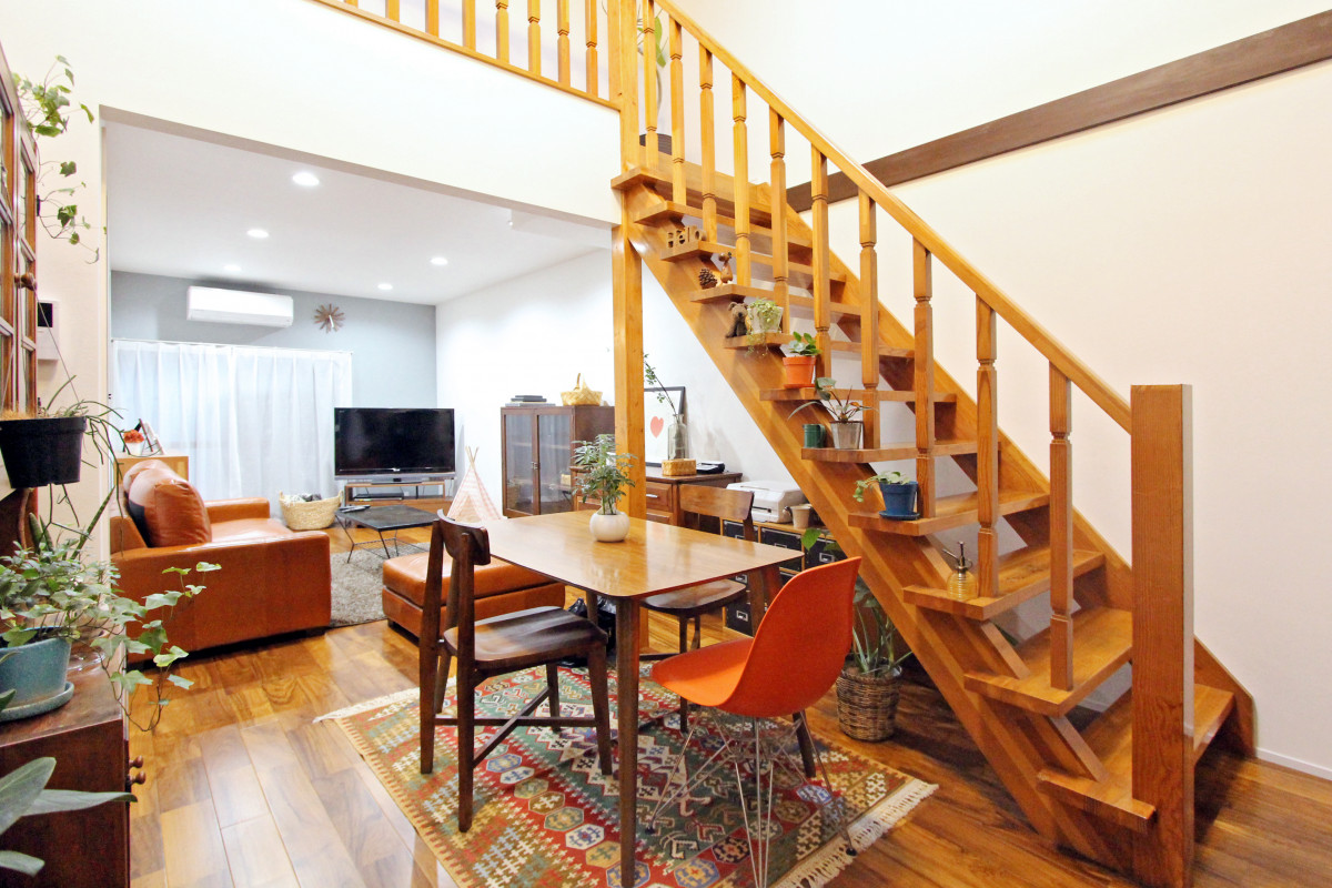 【リビングダイニング】お部屋を分断していた階段を移設することでLDKが一つの空間に。気に⼊られていた階段と2階の手摺格子は既存を再利用。お悩みだった雨樋からの音は、断熱をしっかり施して改善しました。