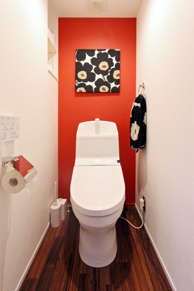 背面壁に真っ赤なアクセントクロスを貼り、巾木も赤色に塗装!
