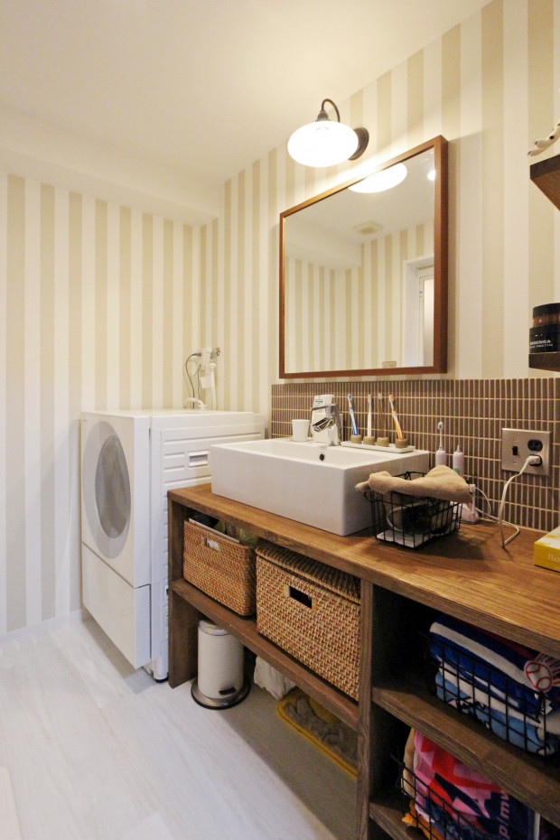 下部に収納を充実させた、造作の洗面台をご提案。お持ちのカゴが納まるように、棚位置を調節しました。