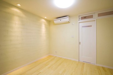 珪藻土を一面だけ塗り分け、ダウンライトを落とすことで部屋のアクセントにしています。
