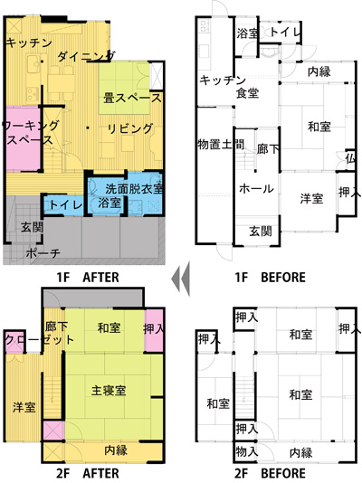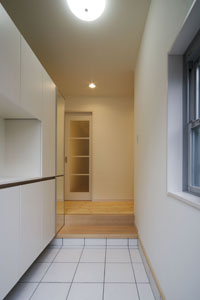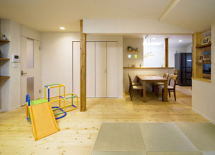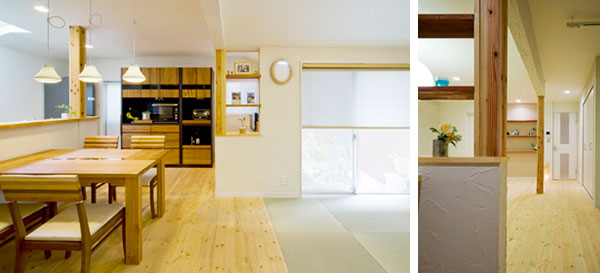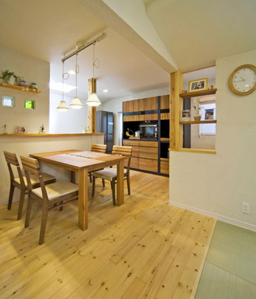 1階は家相や新たに購入される家具に合わせてデザイン・動線・機能・設備も含め、色や素材も全て考慮してコーディネートしました。収納面では物置土間を大収納の納戸にし、収納を集約しました。構造上抜けない柱も木目の板を貼り、空間に調和させました。リビングの床には無垢のパイン材、壁には珪藻土を塗り、デザインだけでなく健康面・機能面でもI様に納得していただけるご提案をしました。