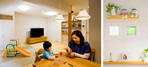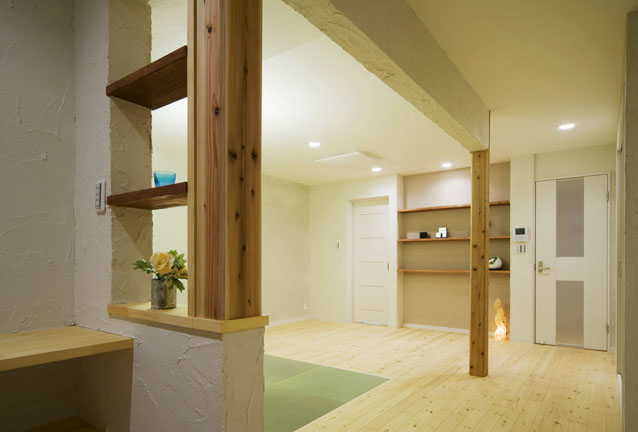はずせない柱は家族の思い出の品々を飾る棚として活用。個性を彩り、圧迫感をなくす効果も。