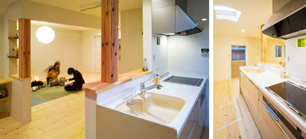 「風水も重視しながら、水まわりの大移動も実現くださる工夫と技術に感動しました」。キッチン前の壁は一部残し、ガラスブロックでご家族らしい「オンリーワン空間」を演出。