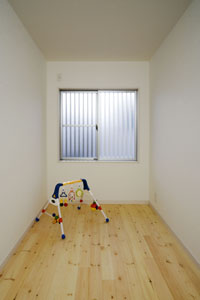 ポイント②素材/お子様がアレルギーをお持ちのため、床に無垢材を選び、かつその中でも傷の付き方を確認して選んだ。