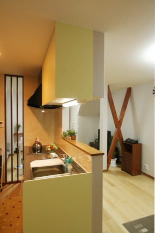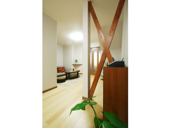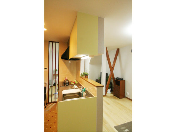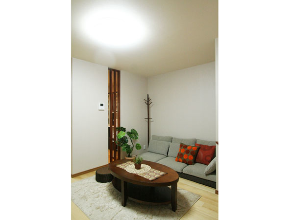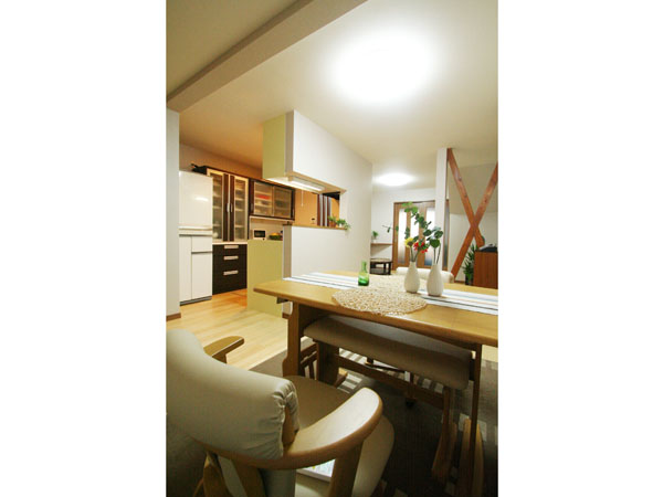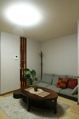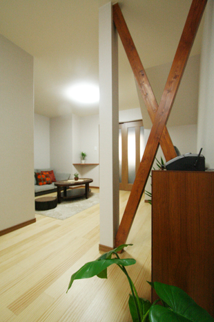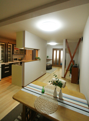 これからのK様の生活を考え、1階での生活スタイルを中心としたバリアフリーを考慮した使いやすい間取りと、機能性をプラスアルファして閉鎖的感を解消するためにスリット格子を使ったり、構造上抜く事が出来ない筋交いはインテリアに合わせて塗装して見せるプランをご提案させて頂きました。