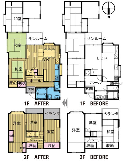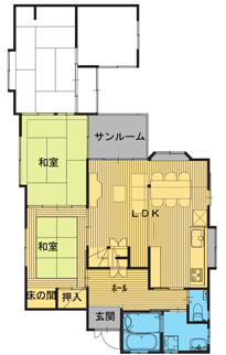 ■施工内容 /水廻り:ハウスドゥ3点セット/トイレ:INAXアメージュV/床:無垢フローリング/壁:珪藻土/和室:琉球畳・無垢フローリング/階段移設/エクステリア/外壁塗装/
