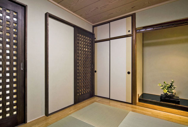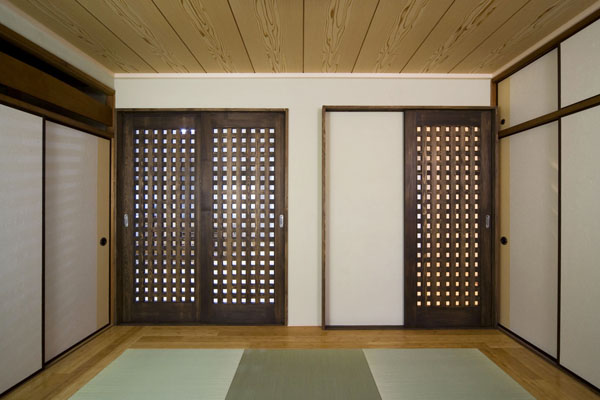 モダンな和室を演出する格子建具を造作。畳の周りには無垢材の堅いフローリングを使用しています。