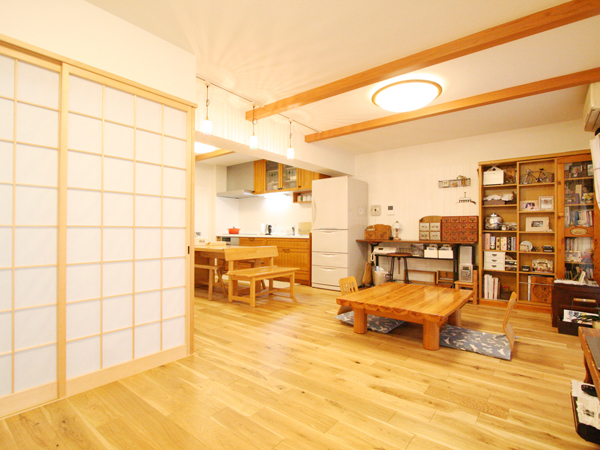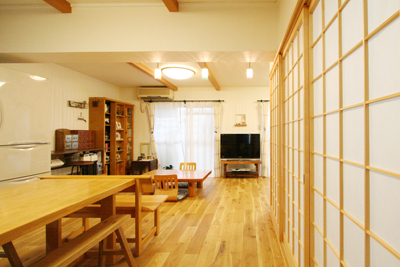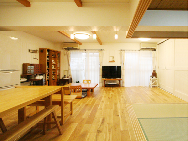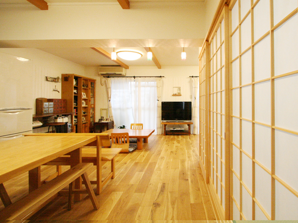 そこで、キッチンや洋室の間仕切壁を取り払い、明るいLDKを提案。和室も間仕切扉を入れることでご家族が来られた時も扉を開けて、1つの空間として広く使えるようにしました。