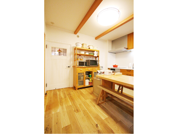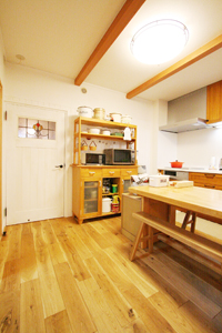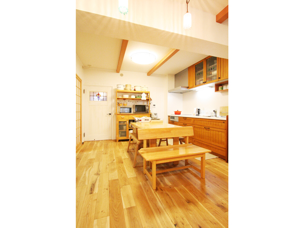 光が伸びるカントリー風のLDK。無垢材と造作建具、家具を合わせることでお客様のイメージした使い込んだイメージに。