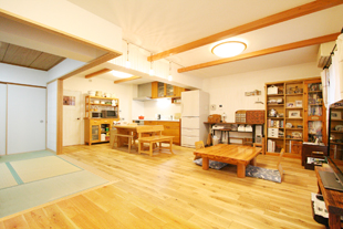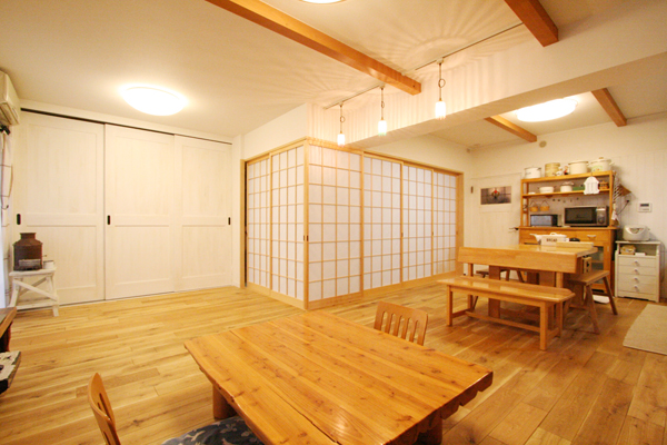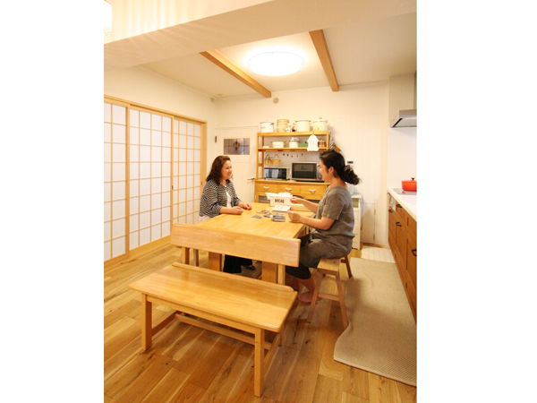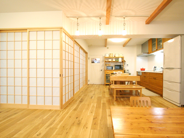 ■施工内容 /キッチン:ウッドワン スイージI型2100/吊戸棚造作/床:無垢材フローリング/天井:クロス/壁:板張り、一部クロス/扉:ステンドグラス入り/間仕切障子造作/ニッチ造作/畳新調/収納造作/