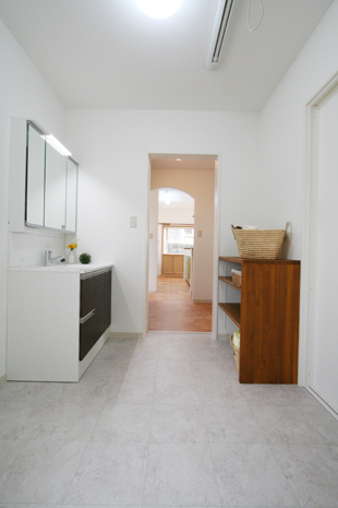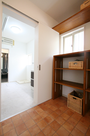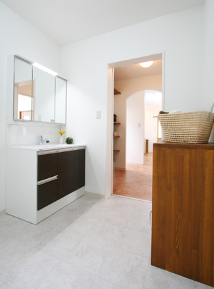 【水廻り動線】ユーティリティーからも行ける洗面脱衣室。行き来しなくてもいいラクラク動線に。