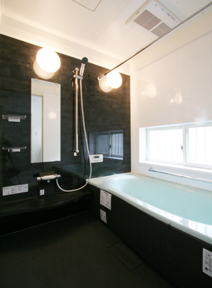 【浴室】シックにしたいとパネルを黒を選ばれたT様。安心感を与えてくれる水色の浴槽が心地よいバスタイムにしてくれます。
