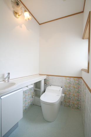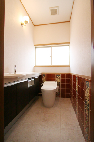 【トイレ】既存のタイルや照明は気に入っているということでそのまま使用。もっと使いやすいように、手洗いカウンターを取付け、落ち着ける空間に。