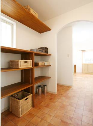 【家事室】調味料やお米、洗剤のストックなど水廻りのものも収納できるユーティリティー。アーチを描く垂壁が、空間をおしゃれに。