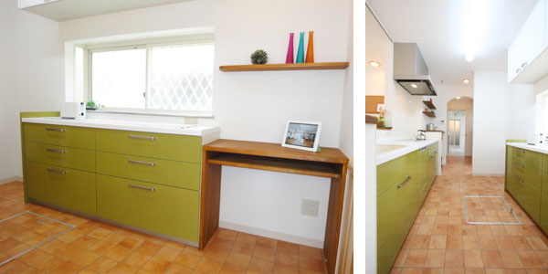 【家事コーナー】パソコンを見たり、ちょっとした作業をするスペースが欲しいと、カップボード横に造作。料理をしながらでも作業できるようにと、キッチン横を提案しました。【水廻り動線】キッチンからユーティリティー、洗面室までつなげることで、動線も短くなり、家事もラクラク。