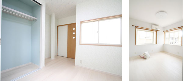 【寝室】1階とは違うナチュラル色の無垢フローリングに、白の壁紙。ナチュラルな空間になり、居心地の良い寝室に。