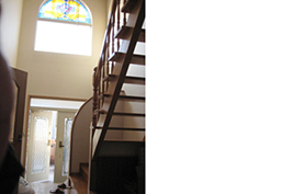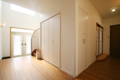 【玄関ホール:階段】ストリップ階段のようなオープンな階段ではなく、落ちないよう壁を作り、スペースを無駄にしないように、階段下には、収納を造作。