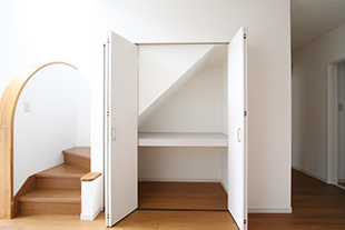 【階段下収納】今まではストリップ階段でポッカリ空いた空間も、収納として活用。