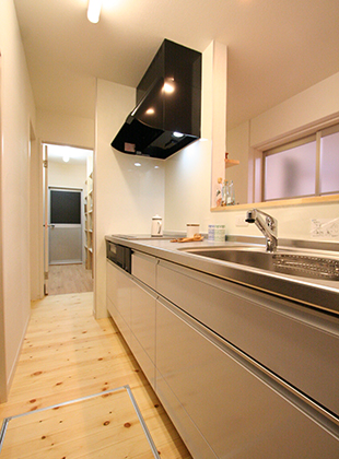 また、キッチンから外を広く見たいという事でしたのでI型キッチンを対面式にレイアウトすることで後ろの窓からは光が入り、前はリビングの大きな窓が見え、視界も広がり、広々と作業して頂けるようにしました。